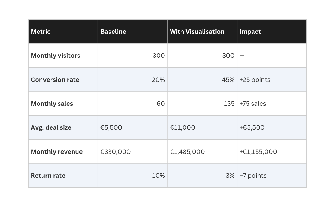 A showroom with 3 full-time salespeople can handle roughly 600 customer interactions monthly. If a quarter of those involve visualisation-assisted sales, and visualisation reduces the cycle from 4 weeks to a single session, you’ve effectively freed up capacity for an additional 150 customers monthly.