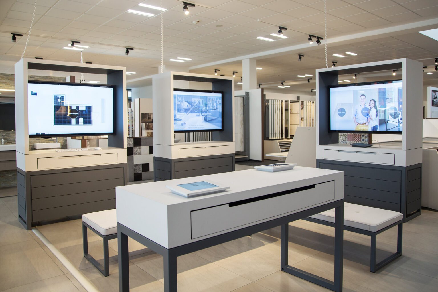 In eleven Raab Karcher Showrooms, Stark Deutschland has also implemented the Digital Showroom in combination with an innovative exhibition furniture from the German producer Hauff. This MACH 3 furniture, equipped with dual displays and an RFID scanner, allows customers to have a real, physical interaction with the tiles to experience the true look and feel, in combination with a digital visualization of the same products in a realistic room context in the Spark Digital Showroom.